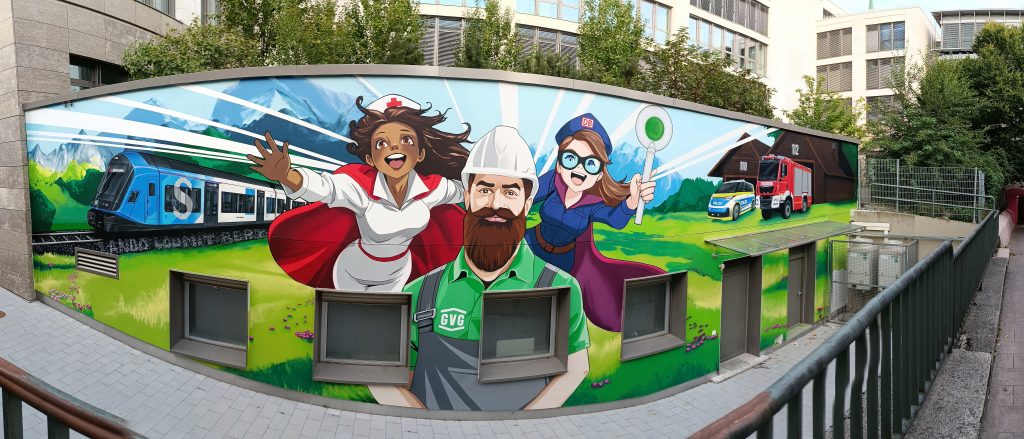 Es ist ein Dank an die Menschen, die täglich Verantwortung für die Aufrechterhaltung der Infrastruktur im Raum München übernehmen – im Gesundheitswesen, bei Polizei oder Feuerwehr, bei der Bahn oder in der Schaffung von Mietraum. Deren Teams brauchen Verstärkung. Deshalb ist das knallbunte Graffiti mit einer Recruiting-Aktion verknüpft.